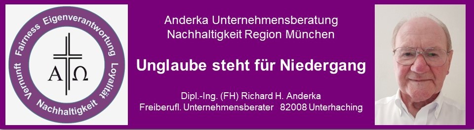 "Unglauben/Atheismus stehen für Niedergang" ist eine empirische Erkenntnis. Sie stehen für den totalen Niedergang, zuerst für den moralischen und dann für den wirtschaftlichen Niedergang. Unglauben/Atheismus beginnen mit dem hinterfragen unserer bewährten, ethischen Werte, die da sind Vernunft, Fairness, Lauterkeit, Eigenverantwortung, Barmherzigkeit. Damit wird der Verfall der Gesellschaft in Gang gesetzt, weil der Zeitgeist all diese bewährten, ethischen Werte, die uns im Grunde von der Bibel vorgegeben sind, nach und nach demontieren darf. Je weniger man sich aber an der Bibel orientiert, umso mehr gehen Vernunft, Fairness, Lauterkeit, Eigenverantwortung, Barmherzigkeit verloren und Unvernunft, Hochmut, Gier, Neid, List und Tücke nehmen deren Plätze ein. Damit wiederum setzt der wirtschaftliche Niedergang ein, denn mit Unvernunft, Hochmut, Gier, Neid, List und Tücke verabschiedet sich letztlich jegliche Nachhaltigkeit. Trotzdem wird, von der UN/UNO von langer Hand vorbereitet, so ein Prozess in Form der „Neuen Weltordnung“, besser bekannt als Migrationspakt, in Europa umgesetzt. Sehen Sie hierzu diesen Link, Seiten 11-12.